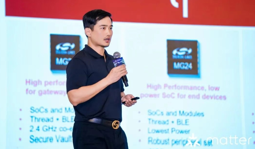 芯科科技高级客户项目工程师 李丰州介绍了针对网关、终端和传感器的全系列芯片方案(如xG21, xG24, xG28),强调其在处理性能、多协议并发(如动态多协议)和安全性上的优势。同时也介绍了Matter在手机移动设备上的应用,以及Matter远距应用场景。