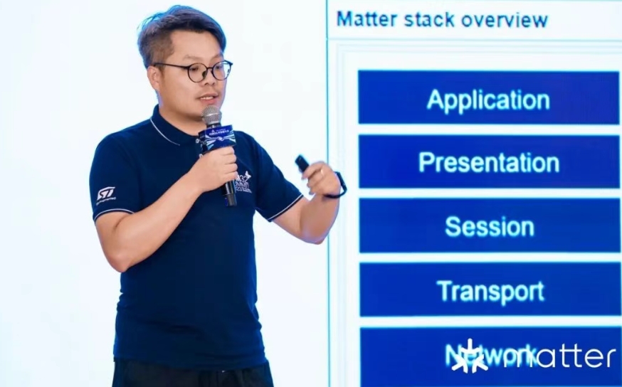 意法半导体微控制器与数字IC事业部无线产品与应用经理 陈海龙重点推介了STM32WBA系列无线MCU对Matter的支持,并演示了利用NFC S-Tag实现“一碰即配网”的极致用户体验。