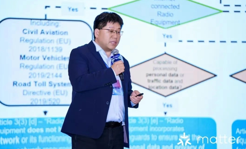 CMGC Matter技术兴趣组/BV专家 裘健重点解读了欧盟RED指令下网络安全法规(EN 303 645)的强制要求(2025年8月1日起),并指出Matter协议在安全设计上“天然适配”RED法规,其内置的设备唯一身份认证、安全密钥交换、安全升级、安全存储与通讯机制(如HIP, CASE, PASE)有效满足了法规核心要求(网络控制、认证、安全更新、安全启动、安全通讯等)。他提供了高效通关的“双合规”(Matter + RED)实战指南。