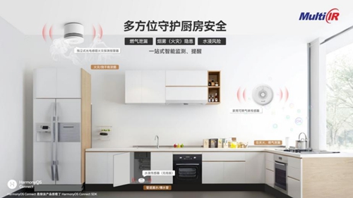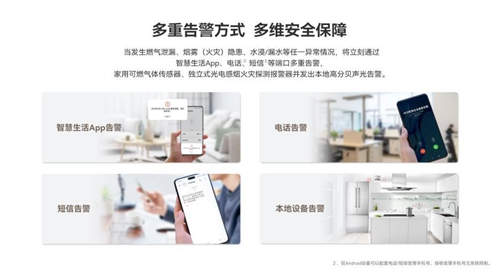 2、多重告警机制。当厨房发生燃气泄漏、烟雾(火灾)隐患、水浸/漏水等任一异常情况,将立刻通过“华为智慧生活App、电话、短信”等端口多重告警,家用可燃气体传感器、独立式光电感烟火灾探测报警器并发出本地高分贝声光告警。其多重告警方式能有效确保用户无论身处何地都能第一时间知晓险情,进而采取有效措施,为生命、财产安全争取宝贵时间。